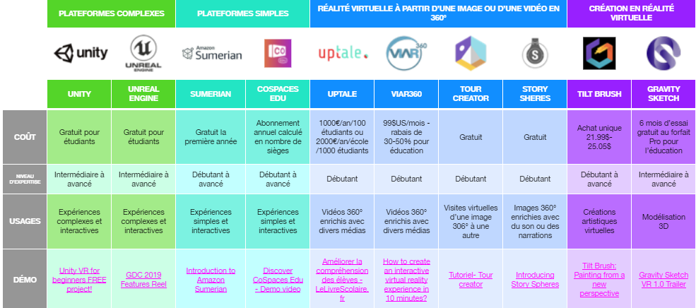 C'est grâce à de nombreux outils exisants aujourd'hui qu'il est possible de réaliser soi-même, et de plus en plus facilement, des mondes virtuels riches en interactivité. Ci-dessous est présentée une liste non-exhaustive des outils de création d'expérience virtuelle les plus populaires.